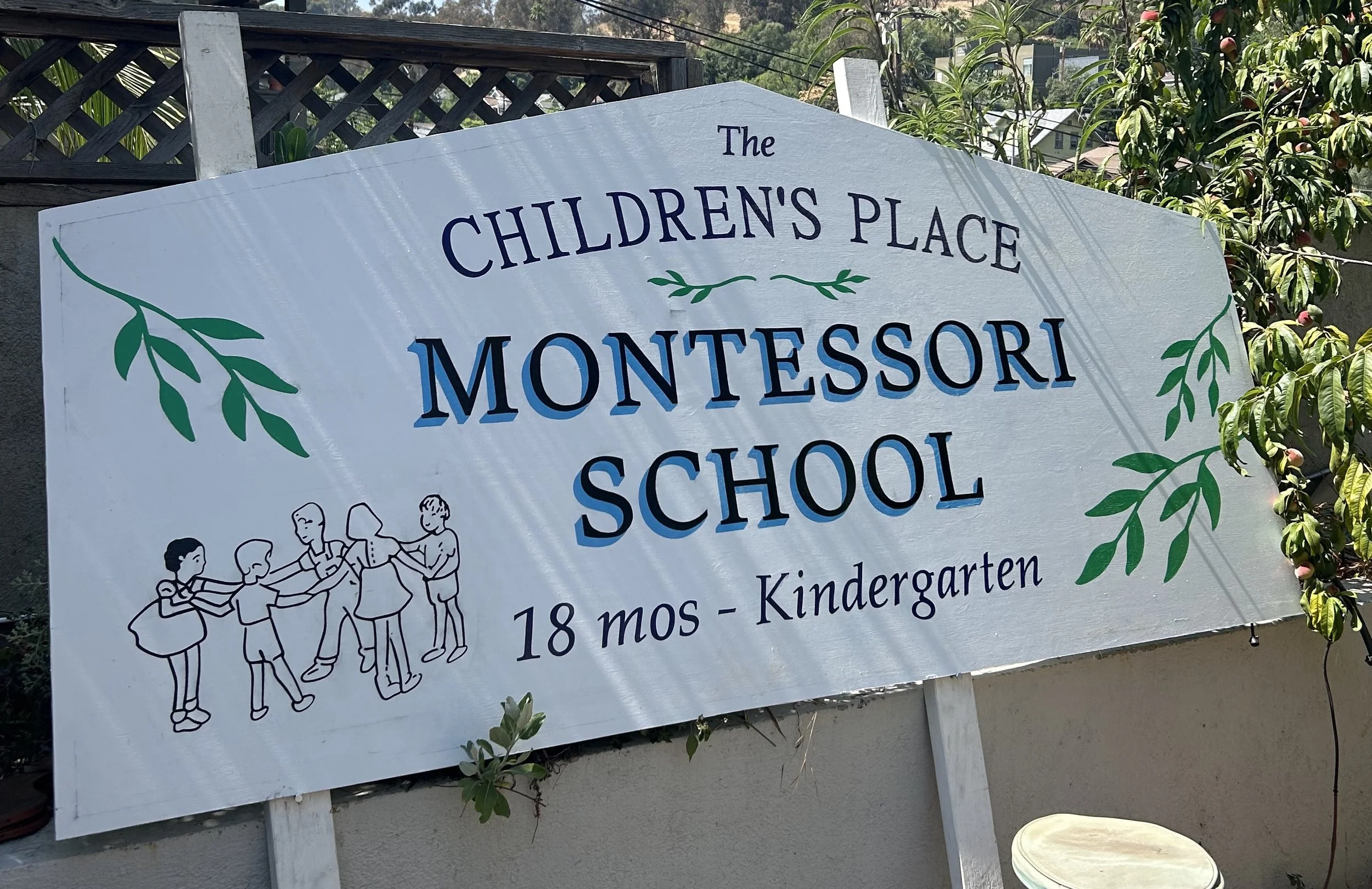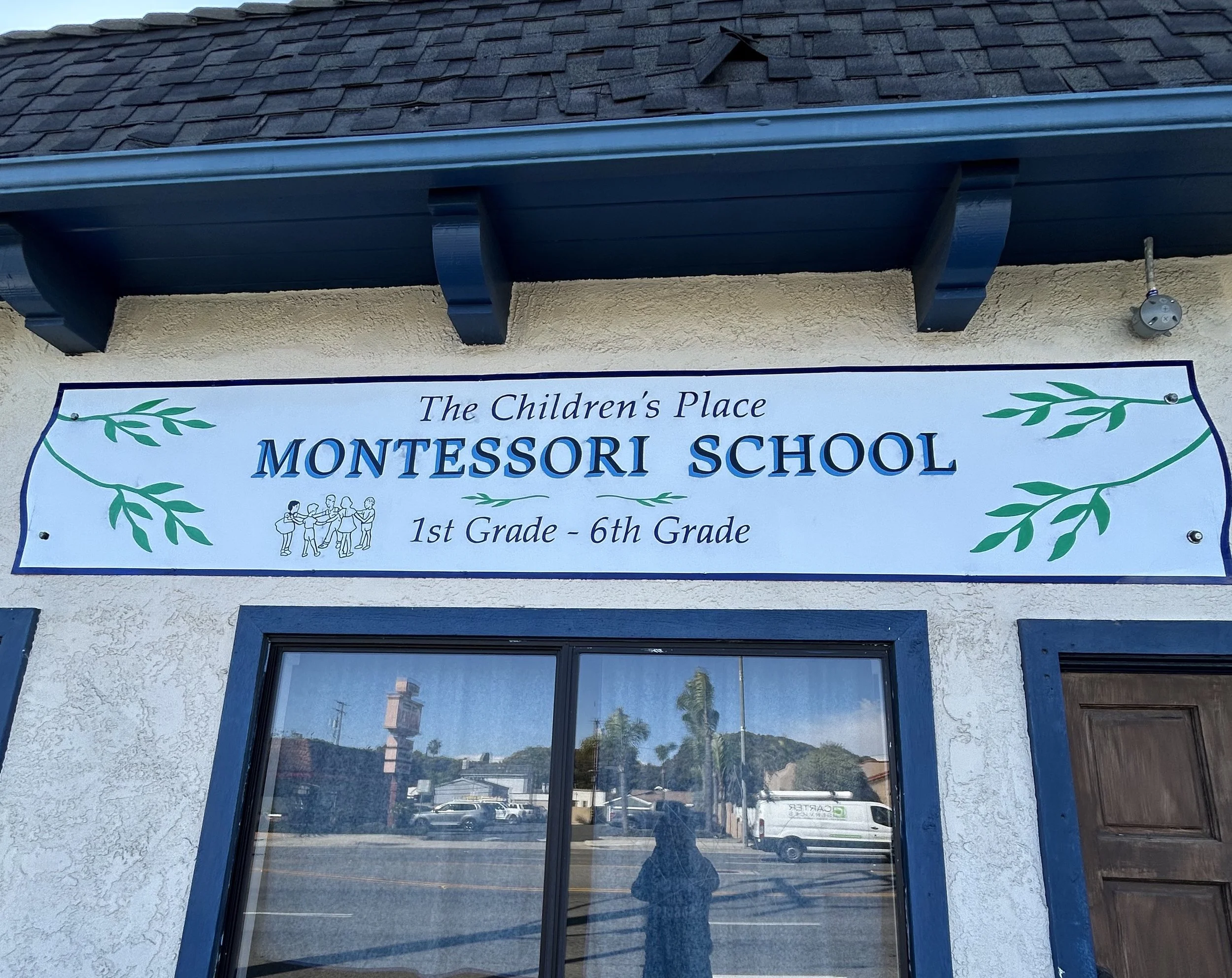 I painted two signs for the The Children’s Place Montessori School in Torrence, CA, one for each of their buildings— the Elementary School and the Pre-School. The first one (above) was painted with One Shot enamel on a piece of metal directly on the building. The second (below) was painted with One Shot enamel on custom-cut MDO wood and then hung up on the facade of the building. Both signs were designed and fully hand painted by me.
